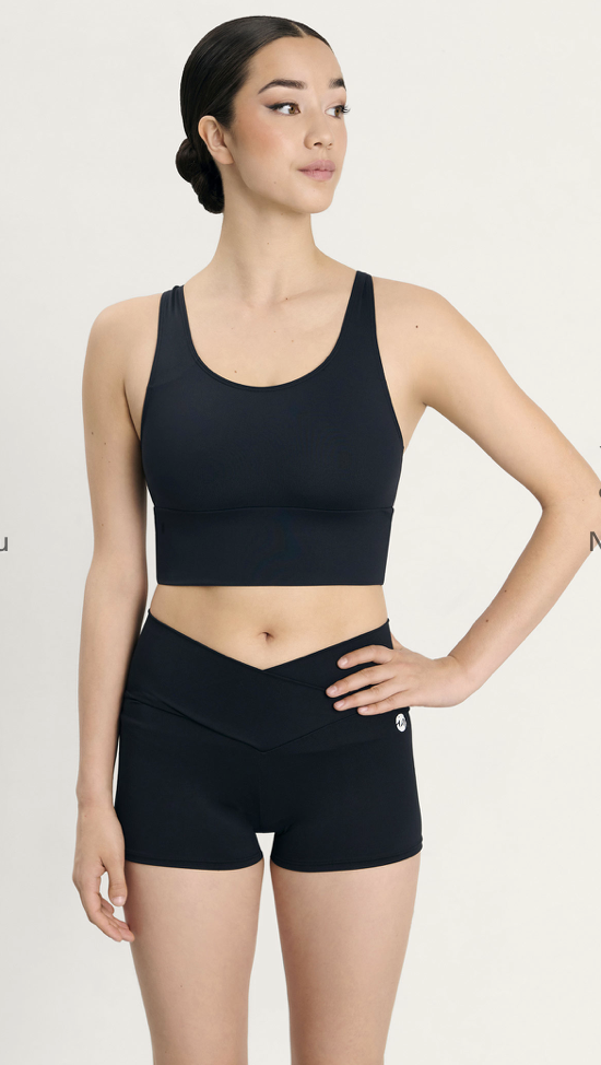 High-waisted shorts with cross waistband and V-shaped seam on the back. Very flattering shape and multi-functional as they can be use both on and off ice.