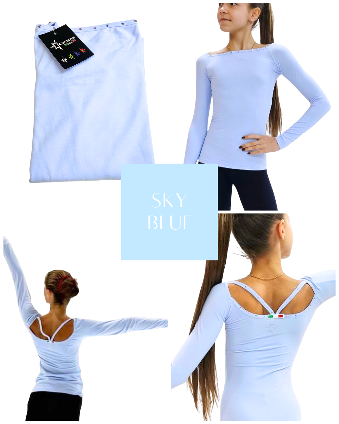 The Titta top with long sleeves in a pastel sky blue colour way featuring beautiful Swarovski crystals is the iconic top by Karisma.